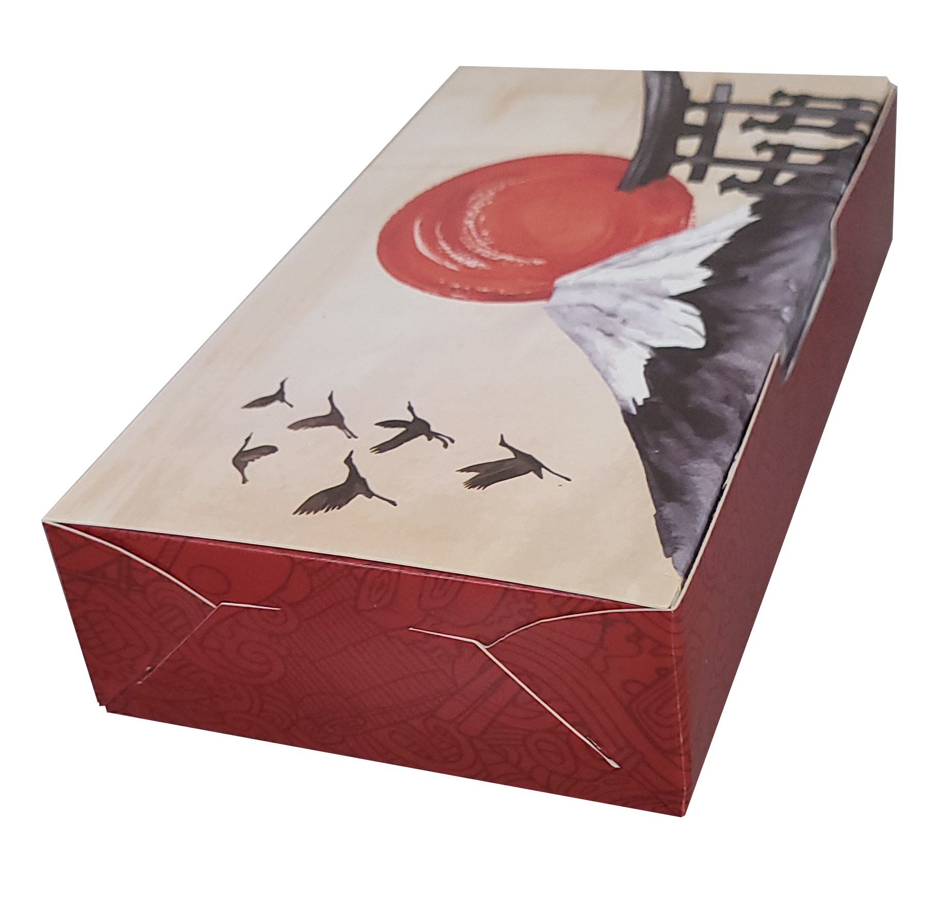 A Caixa 03 Oriental é uma embalagem ideal para o armazenamento e transporte de alimentos da culinária oriental, oferecendo praticidade e uma apresentação elegante. Com estampa temática em vermelho e creme com desenho oriental, valoriza os pratos e proporciona um visual profissional para restaurantes e serviços de delivery.