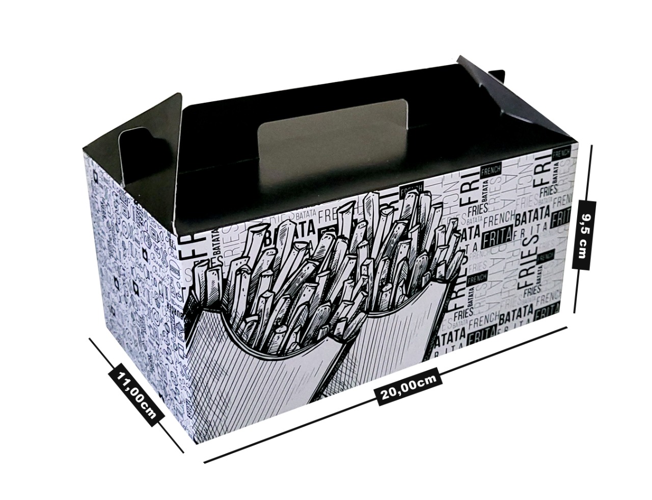 Com medidas de 11 x 20 x 9,5 cm, possui espaço adequado para acomodar hambúrguer e porção de batata frita no mesmo recipiente, facilitando o transporte e mantendo os alimentos organizados. É uma excelente opção para combos de delivery, take-away e fast food.